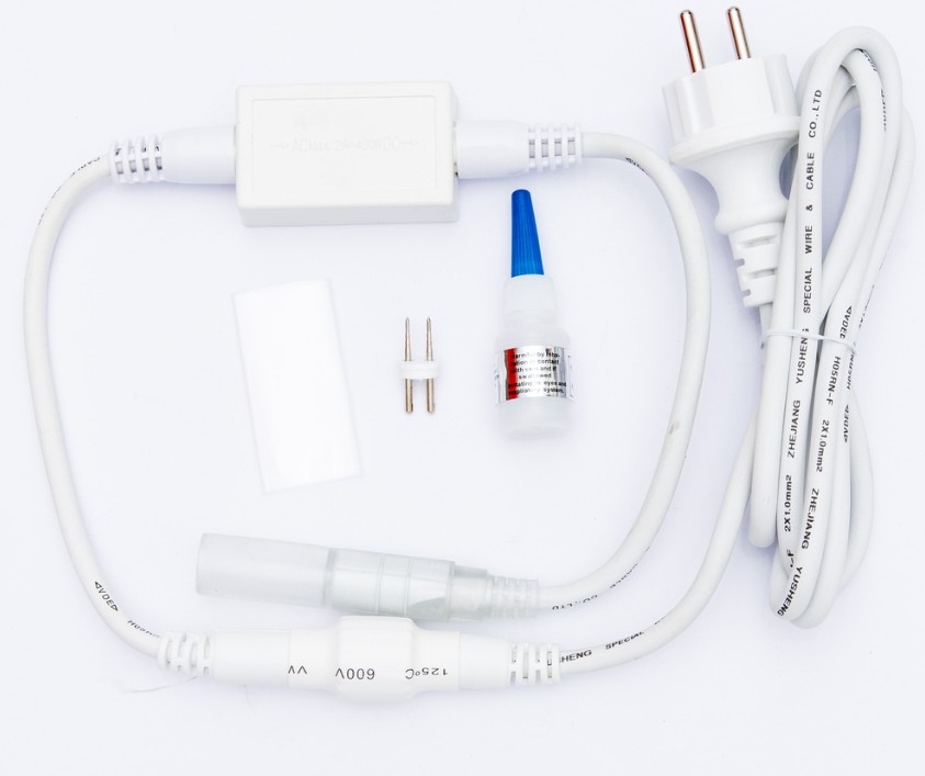 Sada obsahuje - zdroj AC/DC s dĺžkou kábla 1,5m, pripojovací konektor, lepidlo, čiapočku a zmršťovaciu trubičku.